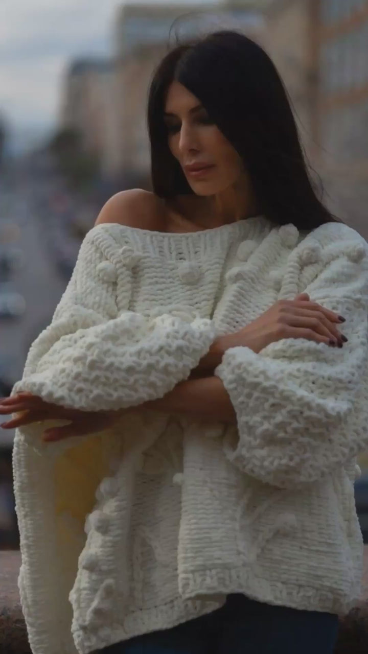 Handcrafted from soft micro-polyester with a velvety texture. The oversized silhouette combined with detailed knitting patterns symbolizes care, creativity, and individuality. White represents light, renewal, and openness, while the plush feel adds coziness and sensual elegance.