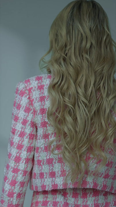 A look that embodies tenderness with character. The pink-white Chanel-style tweed wraps you in warmth, while the blazer paired with the dress creates an effect of delicate luxury, where every detail speaks softly yet confidently. Perfect for women who appreciate feeling feminine, calm, and elegant all at once.
